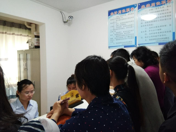 經(jīng)過各部門領(lǐng)導(dǎo)的精心帶領(lǐng)下及各單位同事的幫忙努力下一天的工作終于落幕,順利收房82戶。(圖為前臺(tái)收房及收費(fèi)室)  石婷